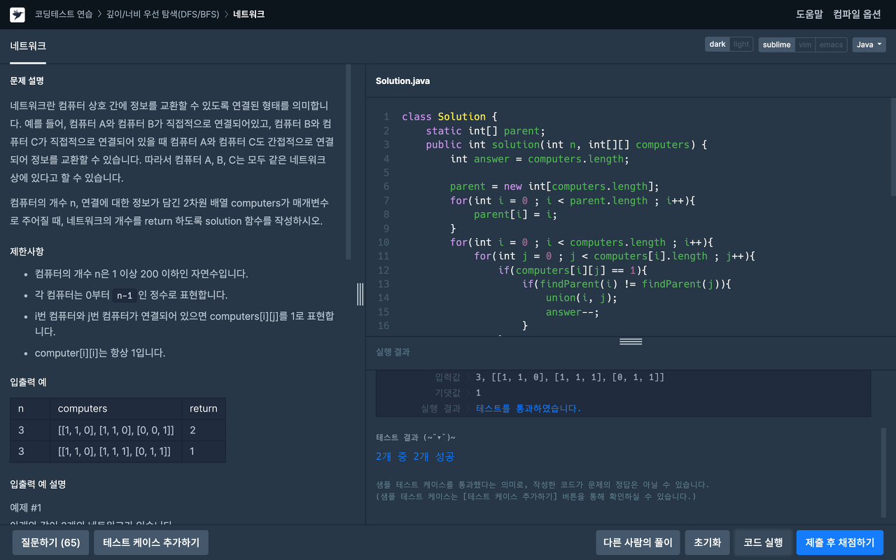 - 프로그래머스에서는 DFS/BFS로 구분되어 있었으나, Disjoint-Set(Union-Find)으로도 풀 수 있다.