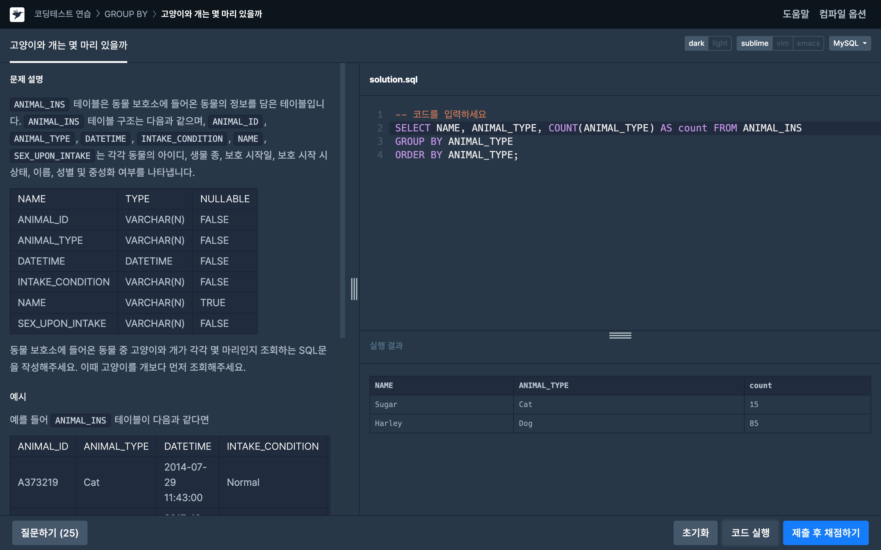 1. 고양이와 개에 대해 따로 count를 하기 위해 GROUP BY ANIMAL_TYPE 을 사용했다.