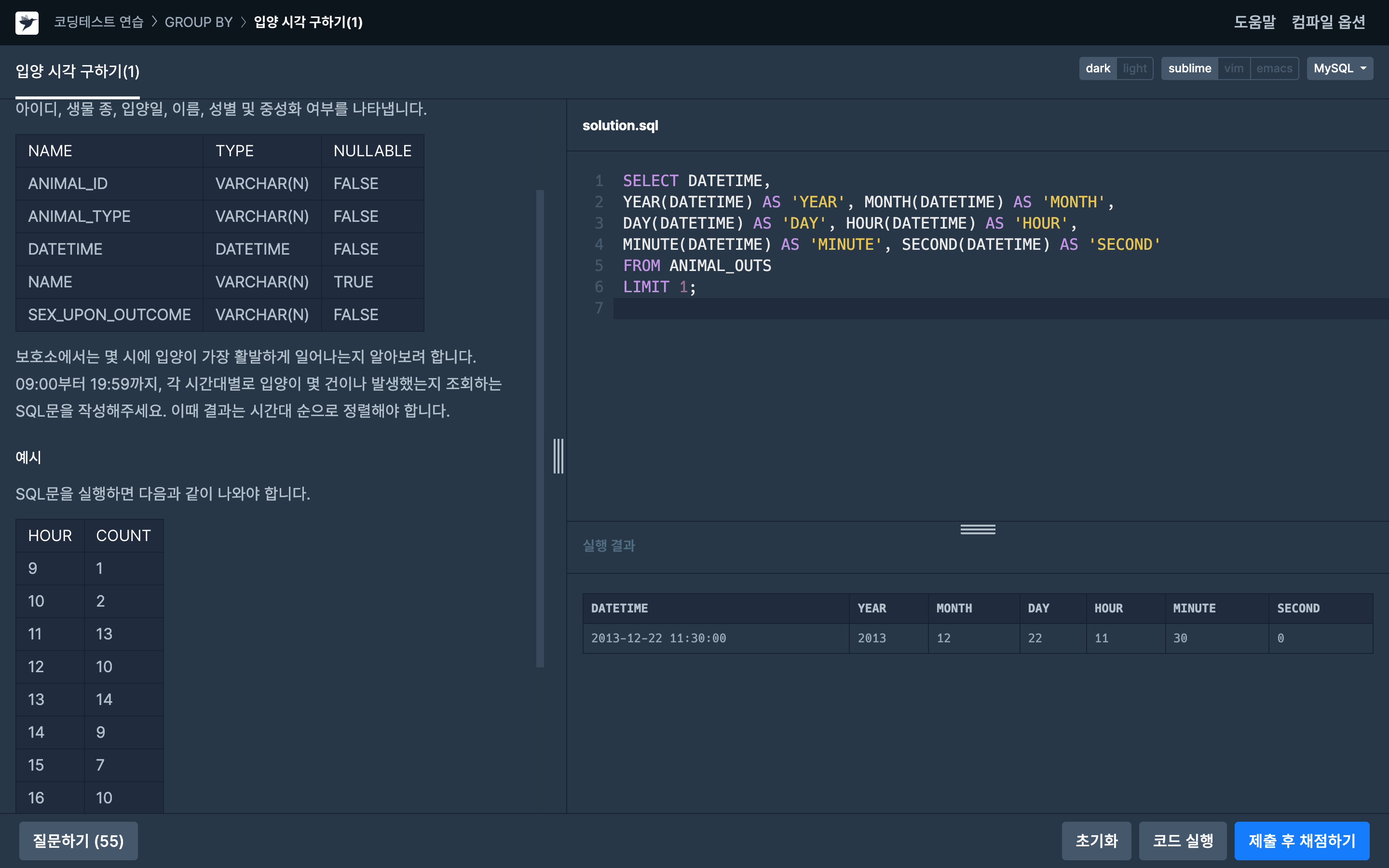 1. 09:00 ~ 19:59 사이에 각 시간대별 입양 건수를 세기 위해 GROUP BY HOUR(DATETIME) 을 사용한다.