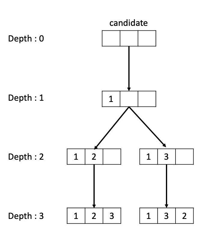- 백트래킹으로 모든 순열을 구할 수 있으며, 테스트 케이스 기준으로 아래와 같이 동작한다. (depth를 인데스로 사용하고 있다.)